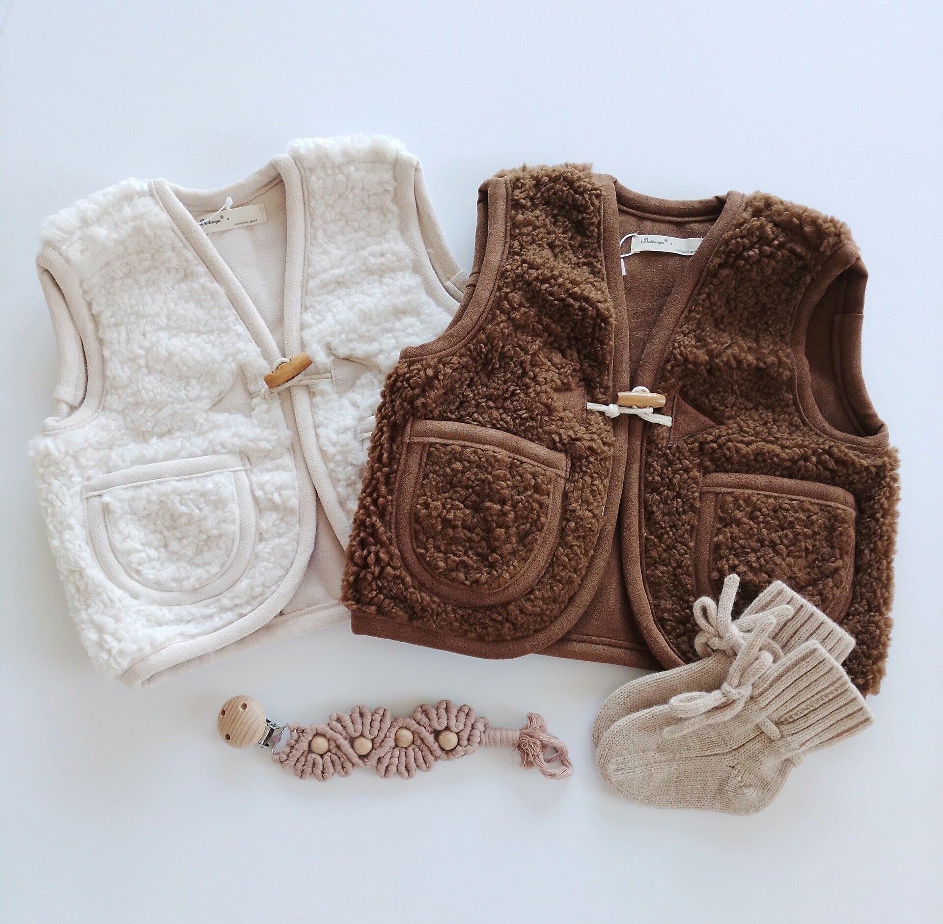 Heerlijk zacht en warm teddy giletje met leuke houtje-touwtje sluiting. Dit giletje past bij bijna elke outfit van je kindje! 100% polyester.